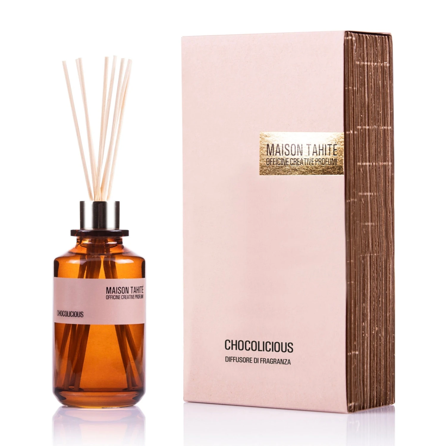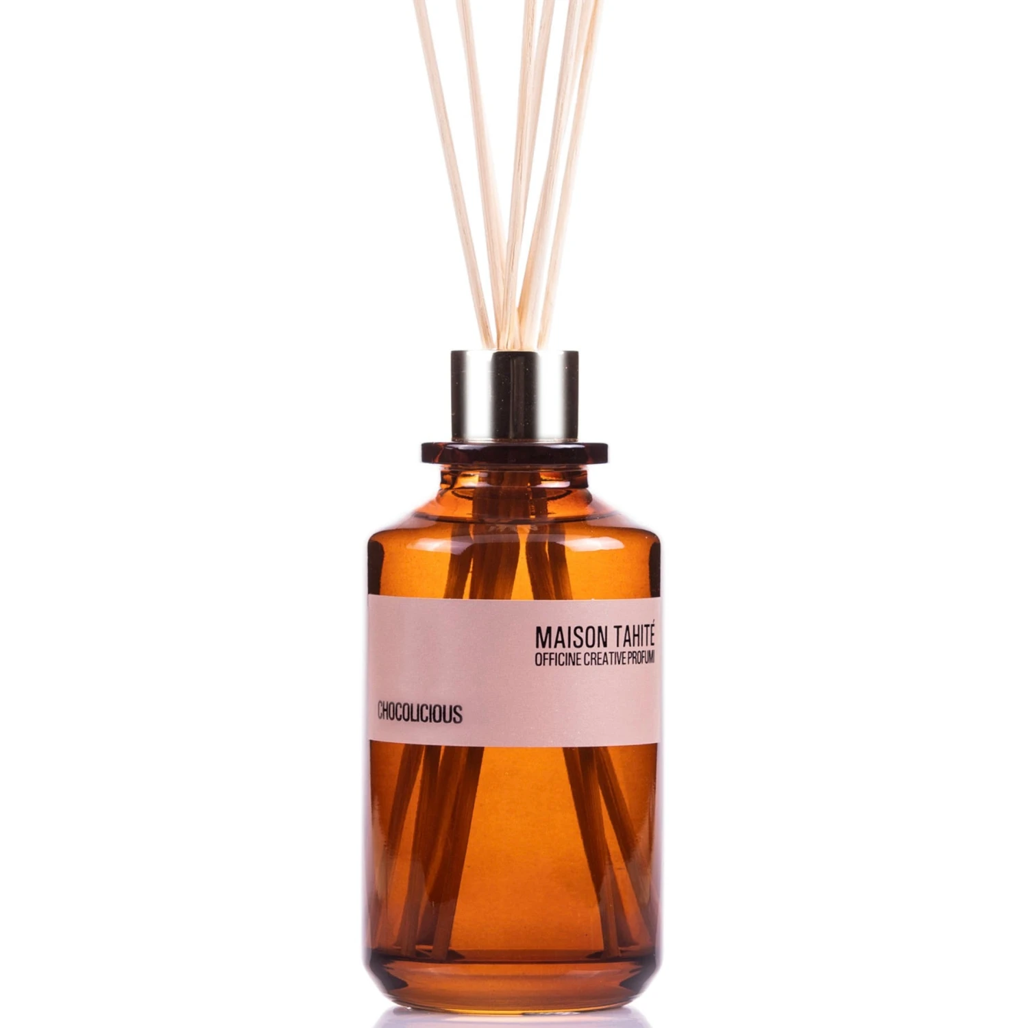 The Maison Tahité Chocolicious fragrance diffuser comes in a charming 200 ml brown glass apothecary bottle. Rich chocolate notes with a salted praline accord. A perfect ambient scent for gourmand-lovers.