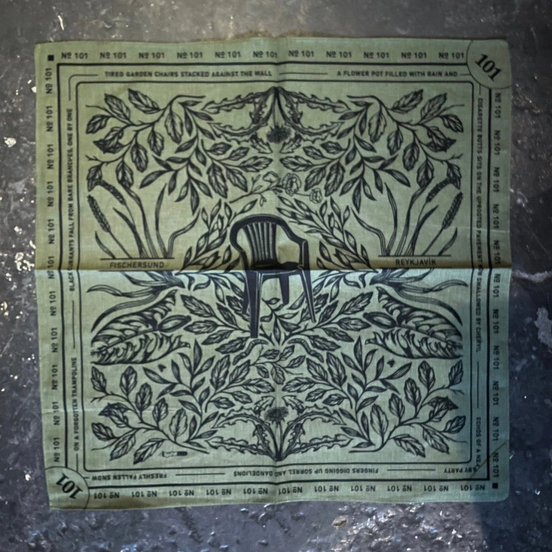 The launch is accompanied by Bakgarðar, a whimsical song composed by Jónsi, Sin Fang and Kjartan Holm that interprets the scent available via a QR code. Each bottle is hand-poured and hand-wrapped in a sustainable Fischersund No. 101 Bandana featuring imaginative illustrations inspired by the new scent drawn by the skillful hands of Fischersund sibling and co-founder, Ingibjörg Birgisdóttir. These signature bandanas have quickly become collectors’ items donning necks, hair, and wrists of people near and far.
