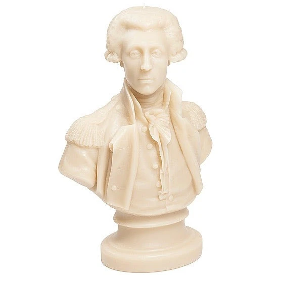 Trudon’s stone-colored wax bust of Lafayette has been molded from an original sculpture at the Louvre museum in Paris. Each piece is hand-finished to remove seam lines and any other imperfections. The hardness of the wax makes it easy to dust, so it should last a very long time as a decorative object.