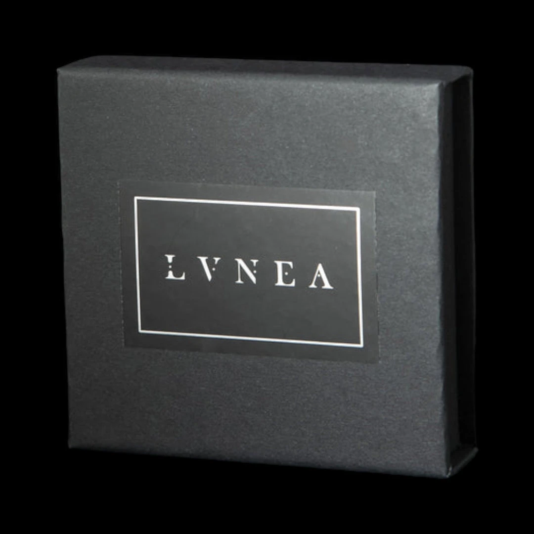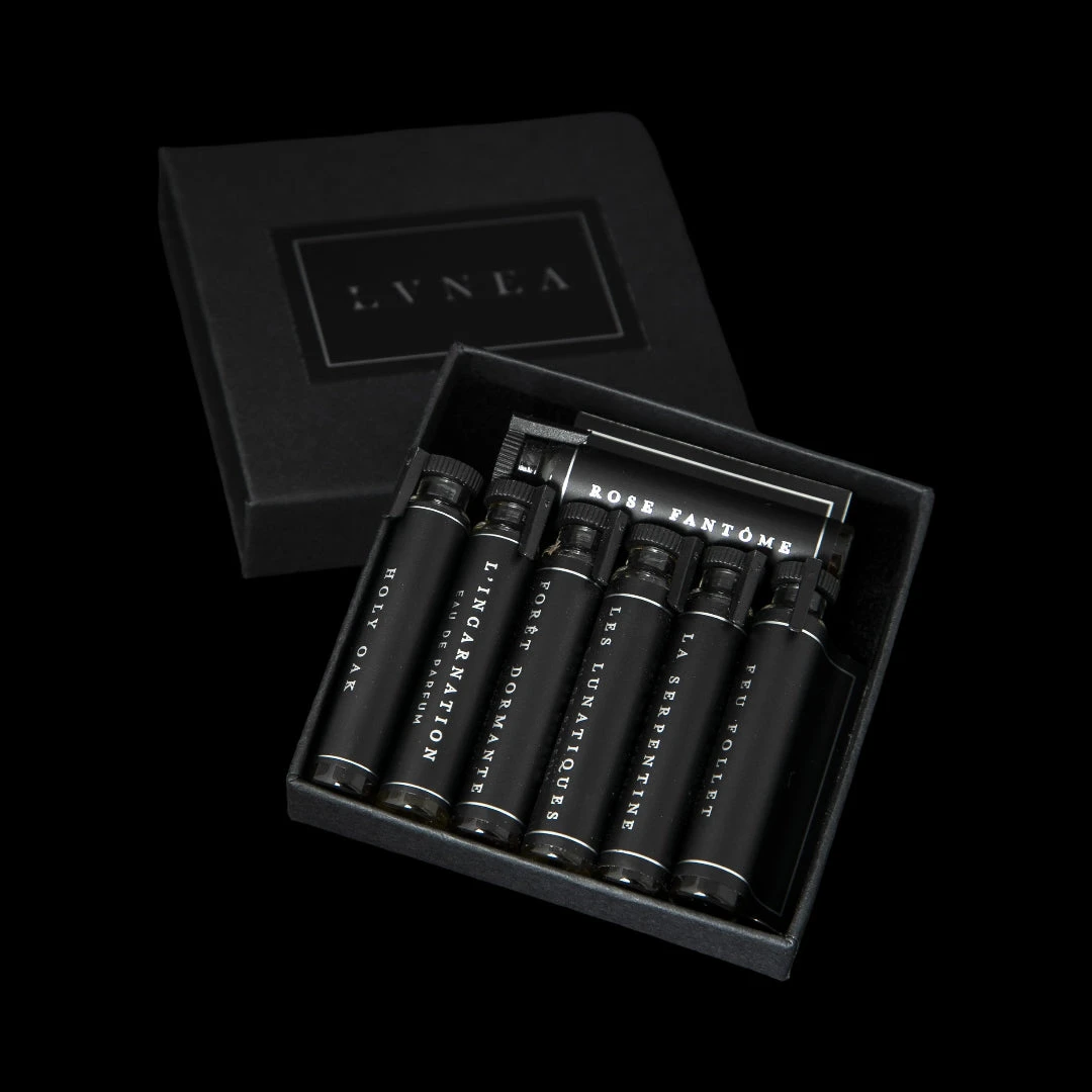 A sample set of all seven of Lvnea’s all-natural eaux de parfums. Seven hand-filled 2ml samples in clear glass vials (no sprayer), presented in a black cardboard box with velvet inlay.