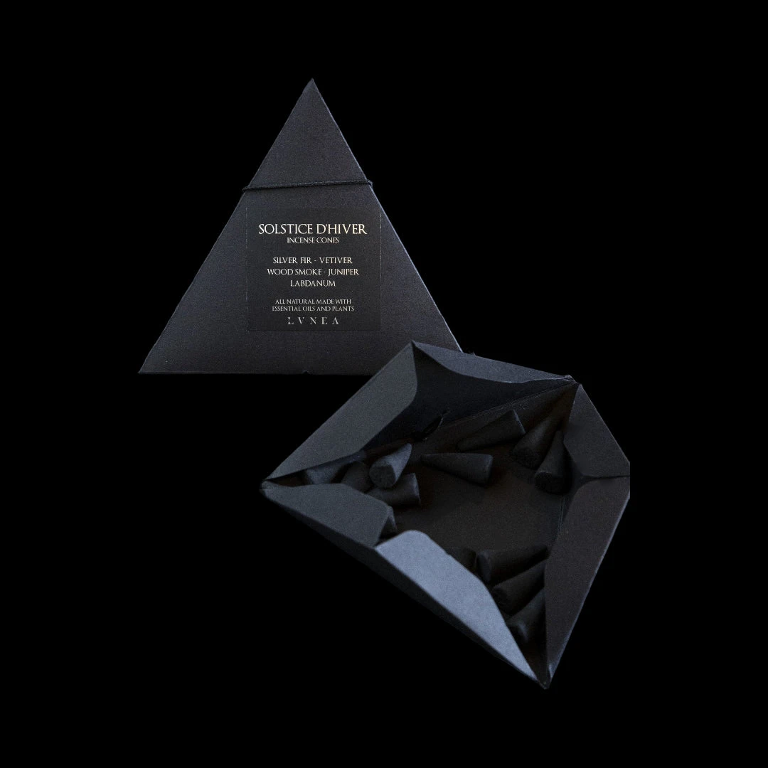 Limited edition naturally-perfumed black incense cones with a warm, woody scent. Housed in a clever, recyclable black paper pyramid perfect for gifting.