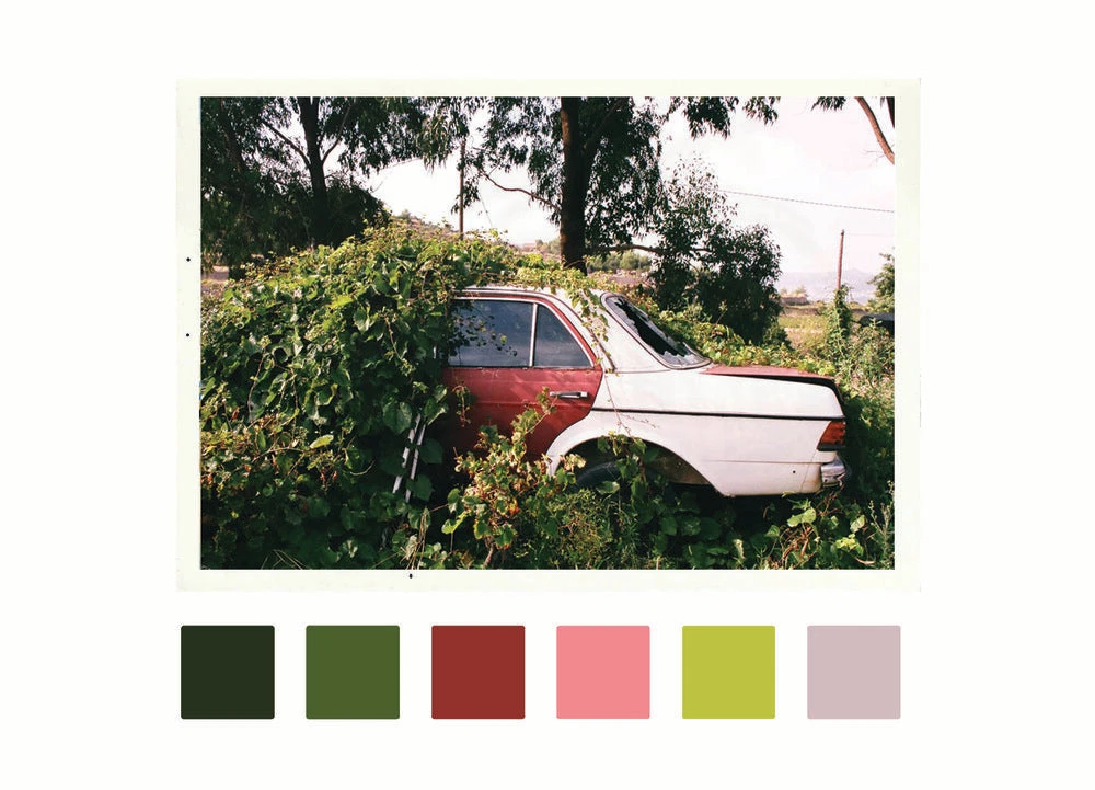 The scent of surrounding Bergamot trees and blossoming Iris has been soaked up by the vegetation that is now flourishing wildly around it like an embrace. The tangled underbelly creeping up the bonnet feels sticky to the touch and emits a green, aromatic and resinous odour. Underneath the foliage, its faded pink and red patina, and liquorice leather interior, shelter from the midday sun.
